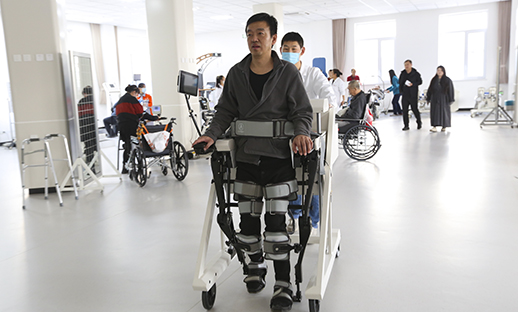 在康复训练室,我们看到了中心比较先进的智能化设备——AI外骨骼康复机器人。它可以让患者站起来、动起来,实现多场景训练、多模式调节、仿生步态、智能康复等多项功能。据介绍,它主要用于辅助下肢关节功能障碍患者进行下肢步行训练,为患者进行下肢关节活动度训练、肌力训练、肌肉牵张训练、减重支持系统训练、平衡功能训练、协调功能训练及步态矫正训练、步行耐力训练等。